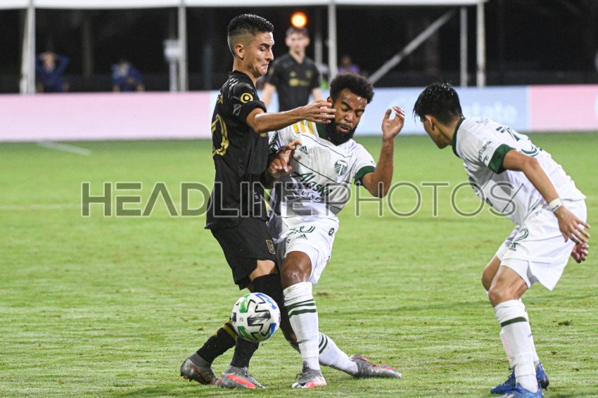 LAFC midfielder Atuesta, Eduard #20 and Portland Timbers midfielder Williamson, Eryk #30 fight for the ball during the MLS is Back Tournament at ESPN Wild World of Sport in Orlando Florida USA. Photo Credit: Marty Jean-Louis