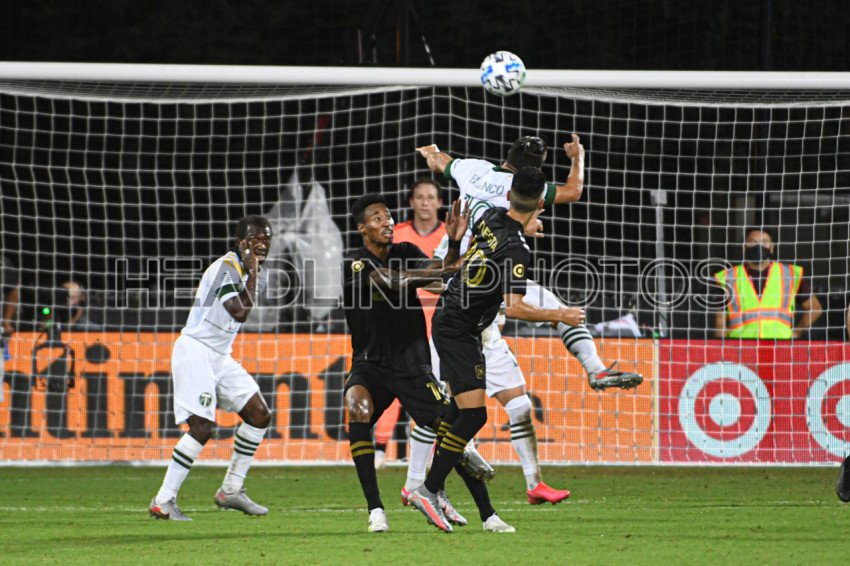 LAFC and Portland Timbers players fight for the header during the MLS is Back Tournament at ESPN Wild World of Sport in Orlando Florida USA. Photo Credit: Marty Jean-Louis