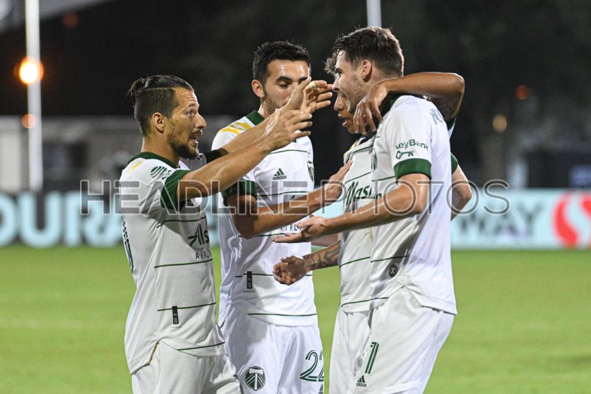 Portland Timbers players celebrate goal during the MLS is Back Tournament at ESPN Wild World of Sport in Orlando Florida USA. Photo Credit: Marty Jean-Louis