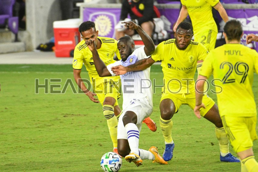 Orlando City SC Player Benji Michel #19 is surrounded by Nashville players at Exploria Stadium on Sunday November 8, 2020 in Orlando Florida USA. Photo Credit: Marty Jean-Louis