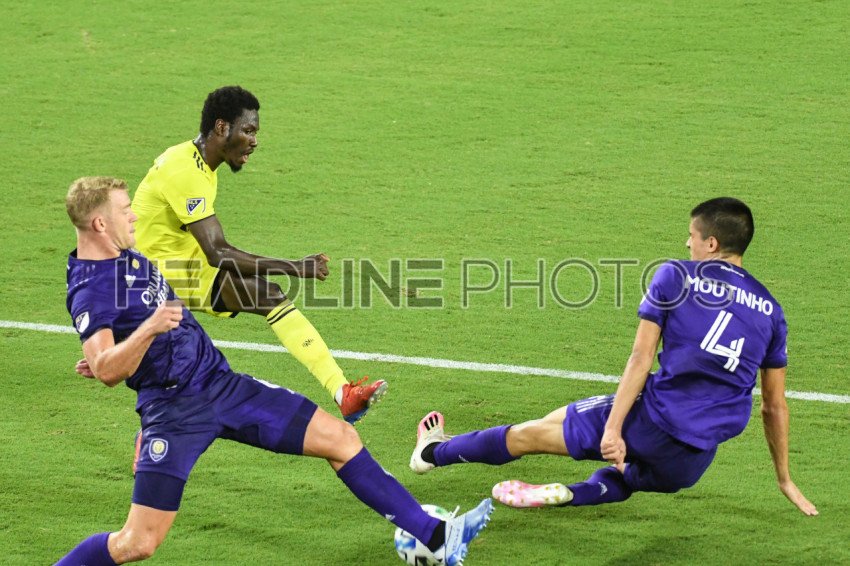 Nashville SC attacker Abu Danladi #7 makes a kick but is blocked by Orlando's defense during the match at Exploria Stadium in Orlando Florida on Wednesday August 26, 2020. Photo Credit: Marty Jean-Louis