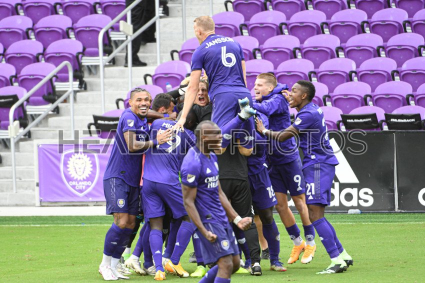 Orlando City SC players celebrate first playoff win at Exploria Stadium in Orlando Florida on Saturday November 21, 2020. Photo Credit: Marty Jean-Louis