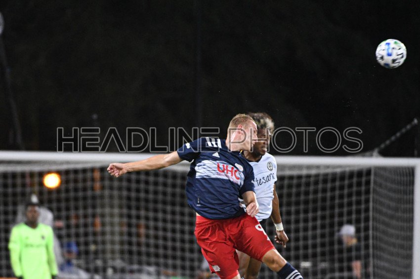 Philadelphia Union and the New England Revolution players fight for the header during the MLS is Back Tournament at ESPN Wild World of Sports in Orlando Florida on Saturday July 26, 2020. Photo Credit: Marty Jean-Louis