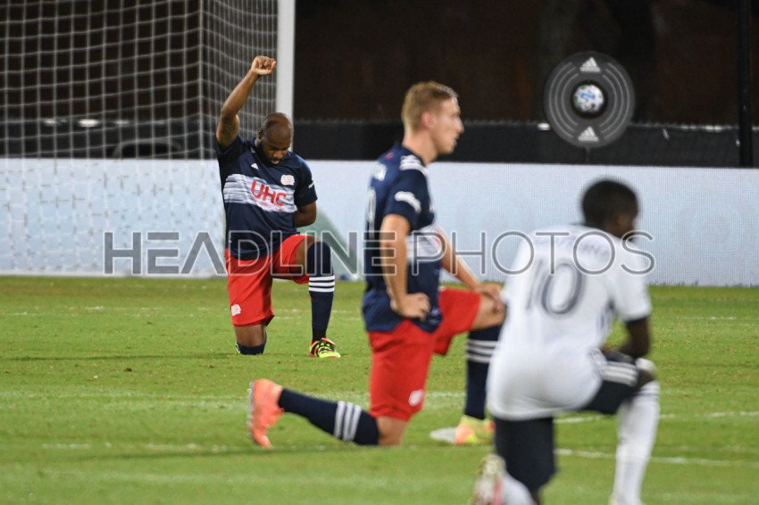 Philadelphia Union and the New England Revolution players kneel in Solidarity with the Black Lives Matter Movement during the MLS is Back Tournament at ESPN Wild World of Sports in Orlando Florida on Saturday July 26, 2020. Photo Credit: Marty Jean-Louis