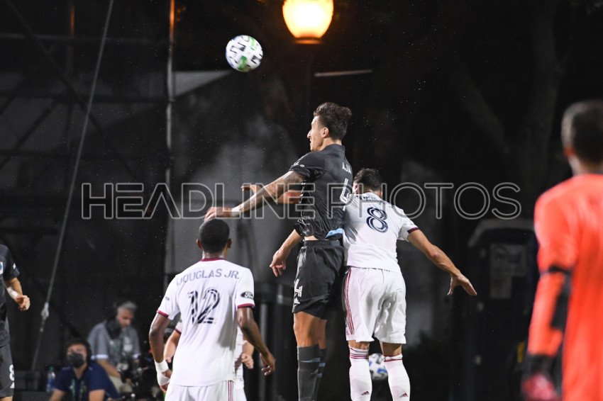 Minnesota United defender Aja, Jose #4 wins the header during the MLS is Back Tournament at ESPN Wild World of Sports in Orlando Florida on Friday July 17, 2020. Photo Credit: Marty Jean-Louis