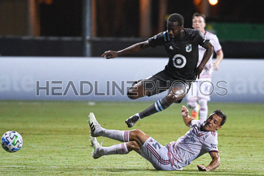 Minnesota United midfielder Molino, Kevin #7 leaps over Real Salt Lake Defender Toia, Donny #4 during the MLS is Back Tournament at ESPN Wild World of Sports in Orlando Florida on Friday July 17, 2020. Photo Credit: Marty Jean-Louis during the MLS is Back Tournament at ESPN Wild World of Sports in Orlando Florida on Friday July 17, 2020. Photo Credit: Marty Jean-Louis