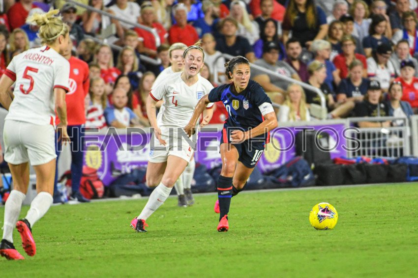 USWNT Player Carli Lloyd #10 runs pass the English players during the 2020 SheBelieves Cup at Exploria Stadium in Orlando Florida on Thursday March 5, 2020. Photo Credit: Marty Jean-Louis