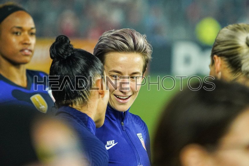 USWNT Player Megan Rapinoe speaking with teammate Carli Lloyd during the 2020 SheBelieves Cup at Exploria Stadium in Orlando Florida on Thursday March 5, 2020. Photo Credit: Marty Jean-Louis