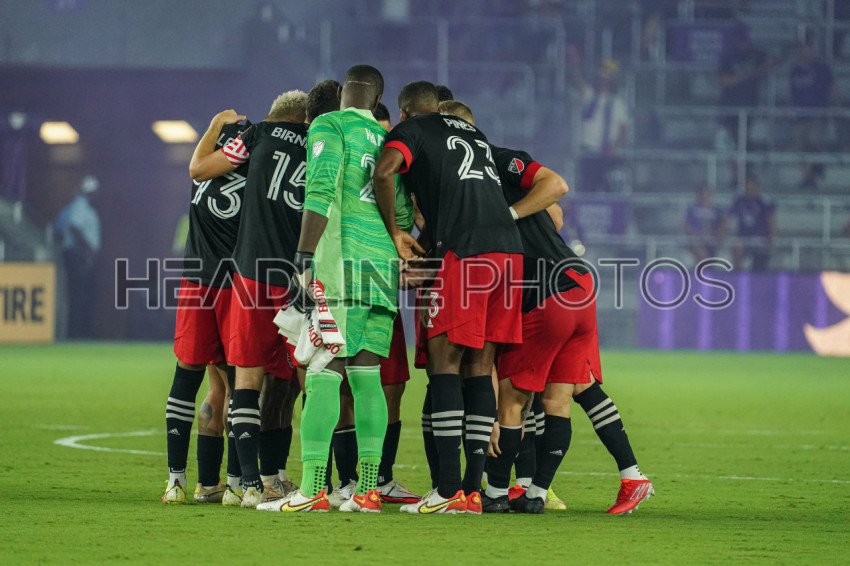 Orlando, Florida, USA, October 2, 2021, DC United players huddle before opening whistle at Exploria Stadium. (Photo Credit: Marty Jean-Louis)
