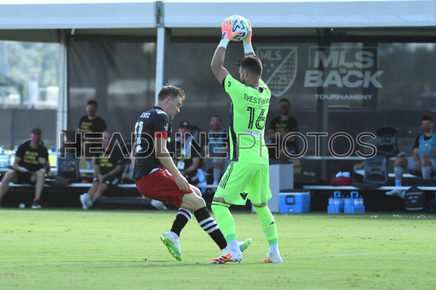 Toronto FC goalkeeper Westberg, Quentin #16 makes a save during the MLS is Back Tournament at ESPN Wild World of Sports in Orlando Florida on Monday July 13, 2020. Photo Credit: Marty Jean-Louis