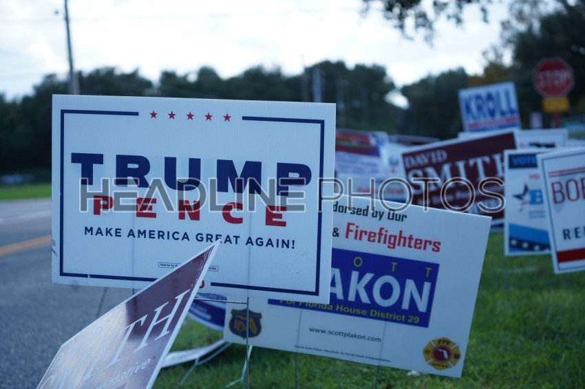 Trump and Pence sign among many place on the grass at the Supervise of Elections Office in Sanford Florida USA on Thursday October 29, 2020. Photo Credit: Marty Jean-Louis