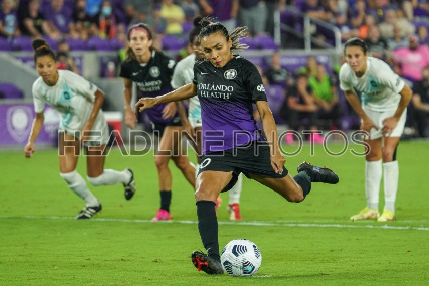 Orlando, Florida, USA, October 9, 2021, Orlando Pride's Marta #10 shoots a penalty kick during the second half at Exploria Stadium. (Photo Credit: Marty Jean-Louis)