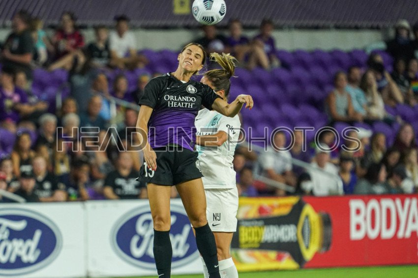 Orlando, Florida, USA, October 9, 2021, Orlando Pride forward Alex Morgan #13 wins the header in the first half of the match at Exploria Stadium. (Photo Credit: Marty Jean-Louis)