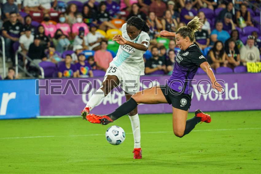 Orlando, Florida, USA, October 9, 2021, Gotham FC player Ifeoma Onumonu #25 attempt to make a pass as the ball is blocked by Orlando Pride defender Amy Turner #4 at Exploria Stadium. (Photo Credit: Marty Jean-Louis)