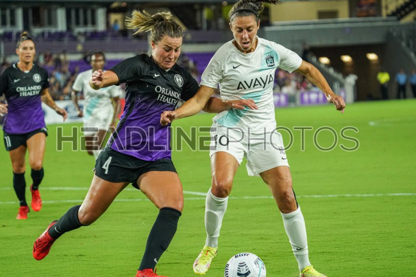 Orlando, Florida, USA, October 9, 2021, Gotham FC players Carli Lloyd and Orlando Pride player Amy Turner #4 fight for the ball in the first half of the match at Exploria Stadium. (Photo Credit: Marty Jean-Louis)