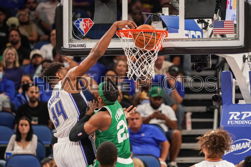 Orlando, Florida, USA, October 13, 2021, Orlando Magic player WEndell Carter Jr #34 makes a dunk against the Celtics at the Amway Center. (Photo Credit: Marty Jean-Louis)