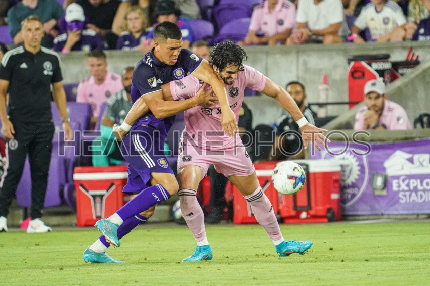Orlando, Florida, USA, July 9, 2022, Inter Miami player Leonardo Campana #9 fight to keep the ball from Orlando City SC player at Exploria Stadium. (Photo Credit: Marty Jean-Louis)