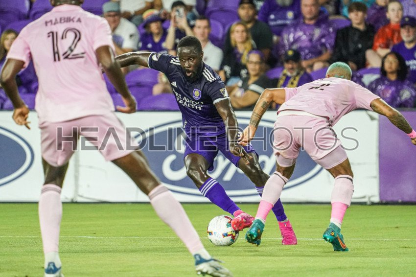 Orlando, Florida, USA, July 9, 2022, Orlando City SC forward Benji Michel #19 attempt to run pass Miami defenders in the first half at Exploria Stadium. (Photo Credit: Marty Jean-Louis)