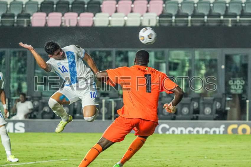 Fort Lauderdale, Florida, USA, July 3, 2021, Guatemala Forward Darwin Lom #14 makes a header and scores during the Concacaf Gold Cup Prelims at Drive Pink Stadium. (Photo Credit: Marty Jean-Louis)