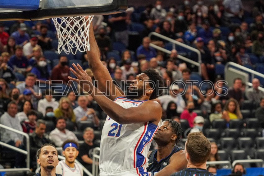 Orlando, Florida, USA, December 30, 2021, Philadelphia 76ers center Joel Embiid #21 makes a layup at the Amway Center. (Photo Credit: Marty Jean-Louis)