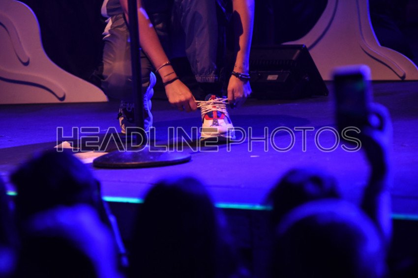 Noah Cyrus ties her sneakers during her performs at the Beacham in Orlando Florida on September 23, 2018