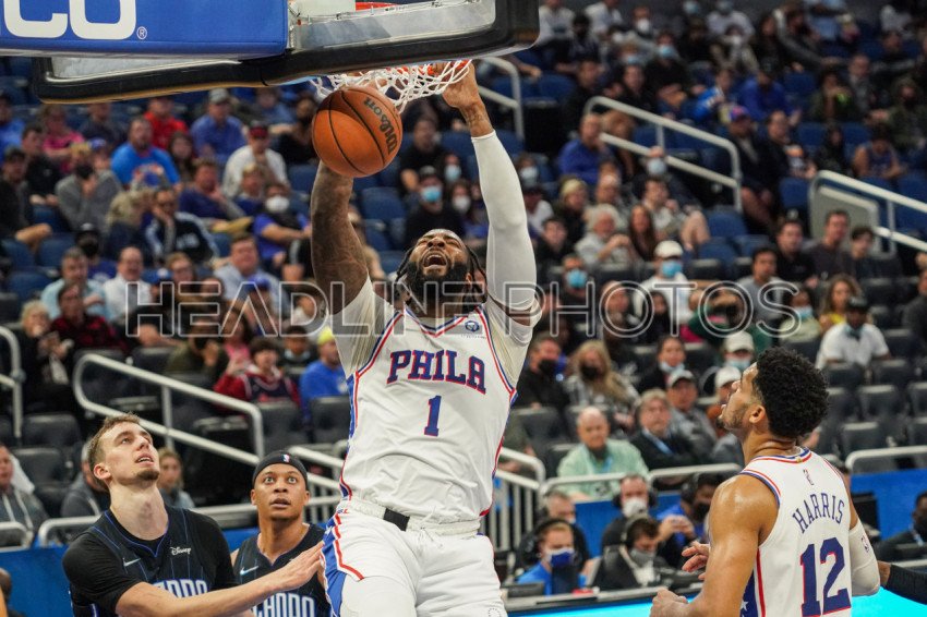 Orlando, Florida, USA, December 30, 2021, Philadelphia 76ers center Andre Drummond #1 makes a dunk against the Orlando Magic at the Amway Center. (Photo Credit: Marty Jean-Louis)