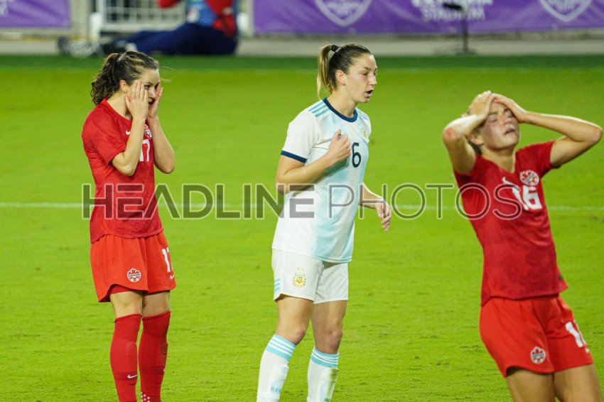 Orlando, Florida, USA, February 21, 2021, Canadian players react after an opportunity to score was missed during the SheBelieves Cup at Exploria Stadium (Photo Credit: Marty Jean-Louis)