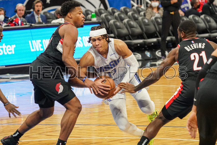 Orlando, Florida, USA, January 17, 2022, Orlando Magic Guard RJ Hampton #13 attempt to run pass through Trail Blazers players at the Amway Center. (Photo Credit: Marty Jean-Louis)