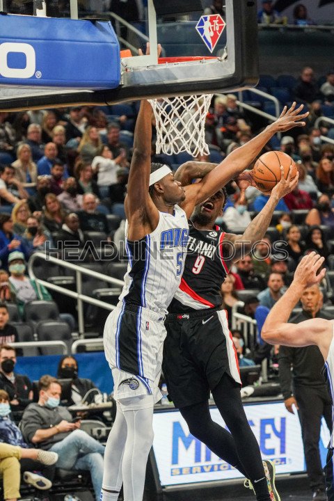 Orlando, Florida, USA, January 17, 2022, Portland Trail Blazers Forward Nassir Little #9 attempt to make a basket but is fouled by Mo Bamba #5 at the Amway Center. (Photo Credit: Marty Jean-Louis)