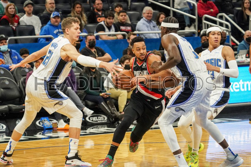 Orlando, Florida, USA, January 17, 2022, Portland Trail Blazers Guard CJ McCollum #3 fights his way through Orlando Magic players during the first quarter at the Amway Center. (Photo Credit: Marty Jean-Louis)