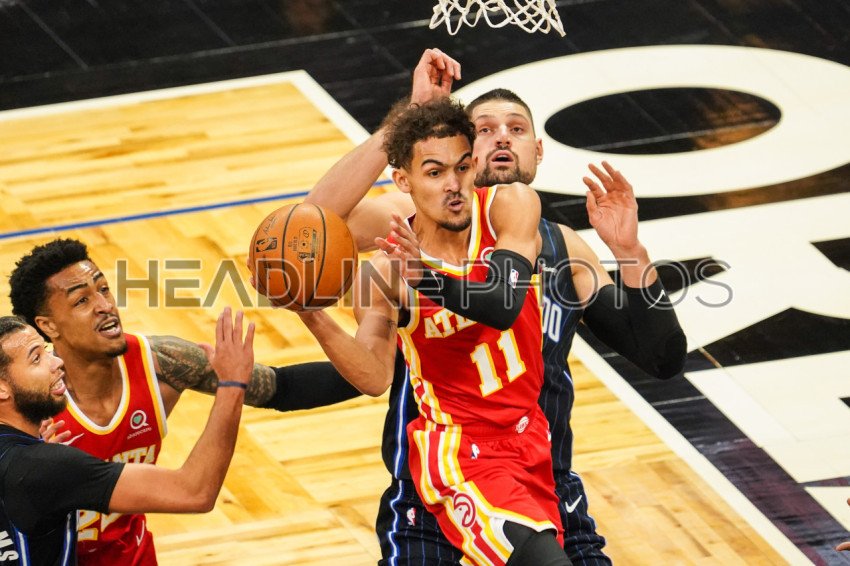 Orlando, Florida, USA, March 3, 2021, Atlanta Hawks Point Guard Trae Young #11 makes a pass under the basket against the Orlando Magic at the Amway Center (Photo Credit: Marty Jean-Louis)