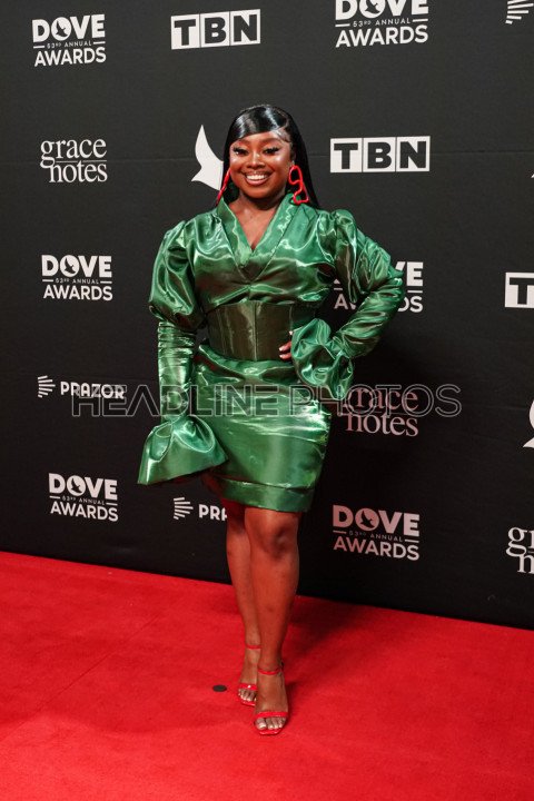 Nashville, Tennessee, USA, October 18, 2022. Jekalyn Carr on the Red Carpet during the 53nd Annual GMA Dove Awards at Lipscomb University in Nashville, Tennessee, USA.