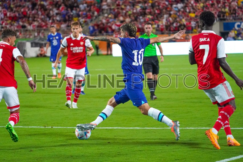 Orlando, Florida, USA, July 23, 2022, Chelsea forward Christian Pulisic #10 pushes forward in the second half in an attempt to score at Camping World Stadium in a Friendly Match. (Photo Credit: Marty Jean-Louis)