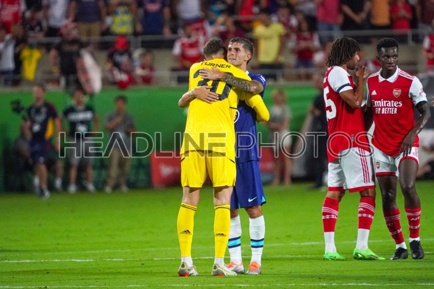 Orlando, Florida, USA, July 23, 2022, Chelsea Forward Christian Pulisic #10 and Arsenal Goalkeeper Matt Turne #30 share a hug and the end of the match at Camping World Stadium in a Friendly Match. (Photo Credit: Marty Jean-Louis)