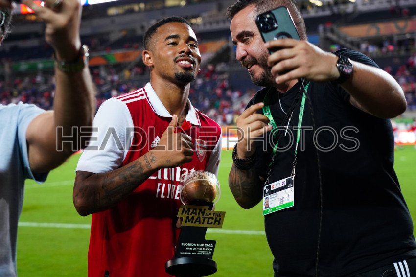 Orlando, Florida, USA, July 23, 2022, Arsenal FC player Gabriel Jesus #9 takes a photo with a journalist after a 4-0 win against Chelsea at Camping World Stadium in a Friendly Match. (Photo Credit: Marty Jean-Louis)