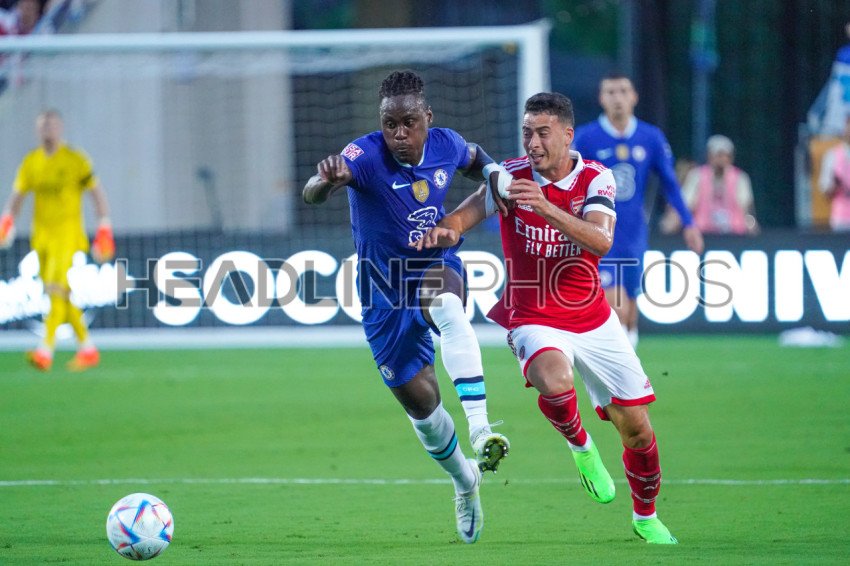 Orlando, Florida, USA, July 23, 2022, Arsenal FC player Gabriel Martinelli #11 and Chelsea's Trevoh Chalobah #14 fight for the ball at Camping World Stadium in a Friendly Match. (Photo Credit: Marty Jean-Louis)