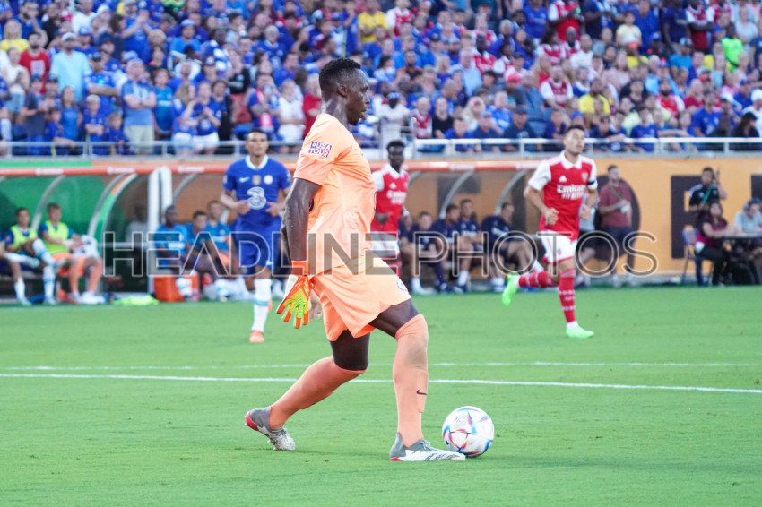 Orlando, Florida, USA, July 23, 2022, Chelsea Goalkeeper Edouard Mendy makes a pass at Camping World Stadium in a Friendly Match. (Photo Credit: Marty Jean-Louis)
