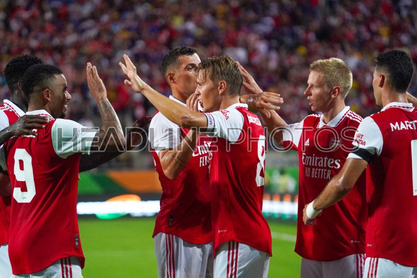 Orlando, Florida, USA, July 23, 2022, Arsenal FC players celebrate after a goal against Chelsea at Camping World Stadium in a Friendly Match. (Photo Credit: Marty Jean-Louis)