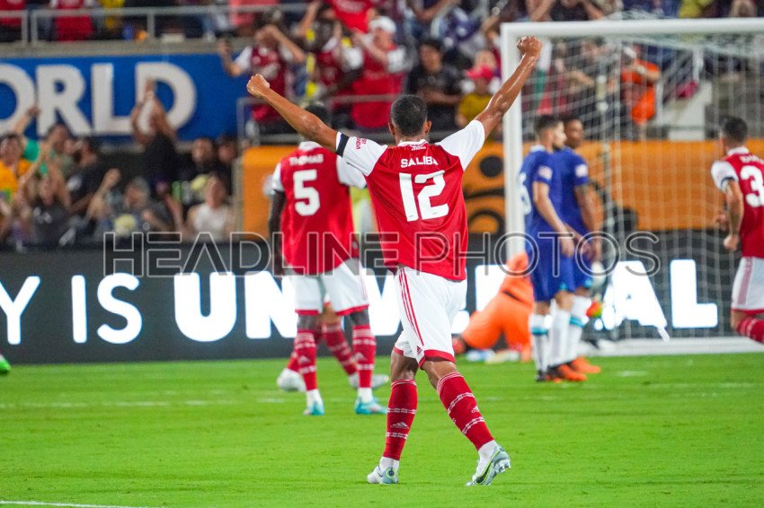 Orlando, Florida, USA, July 23, 2022, Arsenal player William Saliba #12 celebrate after a goal against Chelsea at Camping World Stadium in a Friendly Match. (Photo Credit: Marty Jean-Louis)