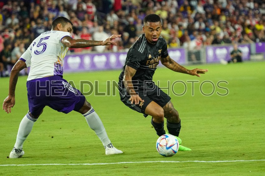 Orlando, Florida, USA, July 20, 2022, Arsenal FC forward Gabriel Jesus #9 runs pass defender Antonio Carlos #25 during the second half at Exploria Stadium in a Friendly Match. (Photo Credit: Marty Jean-Louis)