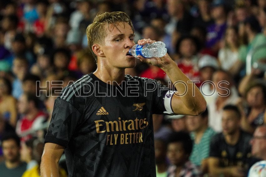 Orlando, Florida, USA, July 20, 2022, Arsenal FC player Martin Odegaard #8 drinks some water before taking a corner shot in the second half at Exploria Stadium in a Friendly Match. (Photo Credit: Marty Jean-Louis)
