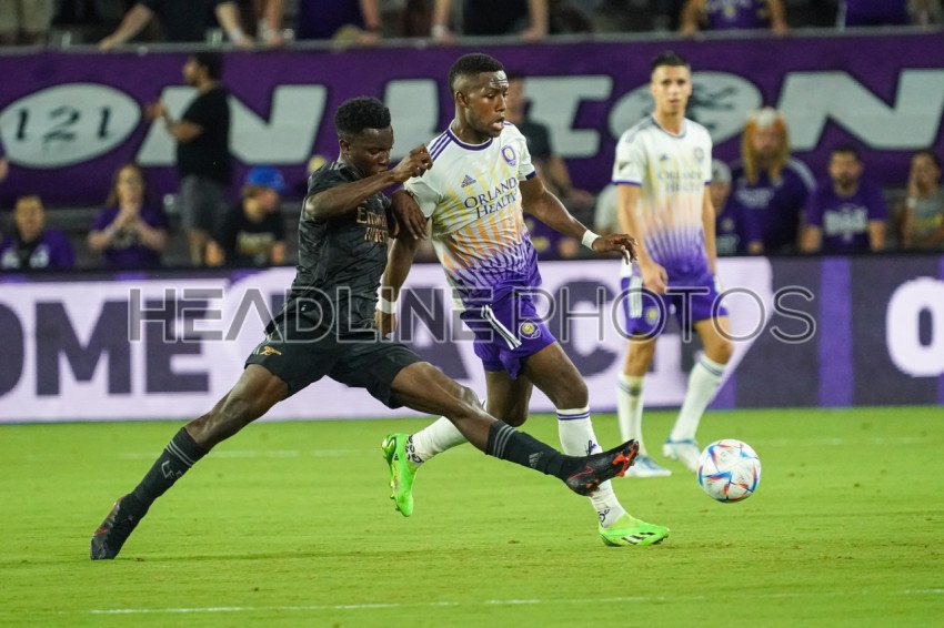 Orlando, Florida, USA, July 20, 2022, Arsenal FC forward Eddie Nketiah #14 attempt to steal the ball Orlando City's Andres Perea #21 at Exploria Stadium in a Friendly Match. (Photo Credit: Marty Jean-Louis)