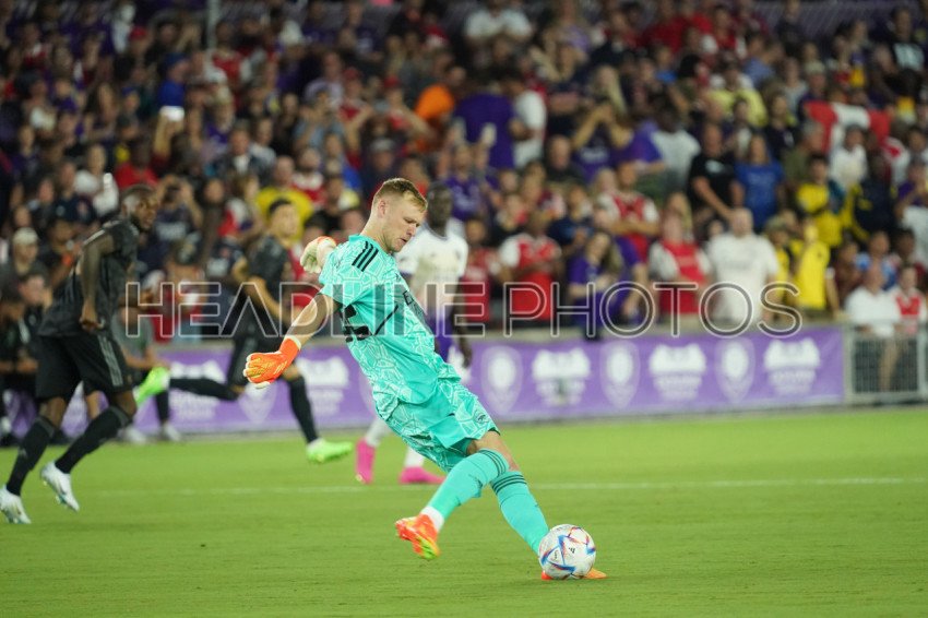 Orlando, Florida, USA, July 20, 2022, Arsenal FC Goalkeeper Aaron Ramsdale #32 makes a kick in the first half at Exploria Stadium in a Friendly Match. (Photo Credit: Marty Jean-Louis)
