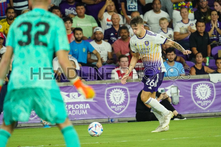 Orlando, Florida, USA, July 20, 2022, Orlando City player Michael Halliday #26 readies to make a pass at Exploria Stadium in a Friendly Match. (Photo Credit: Marty Jean-Louis)