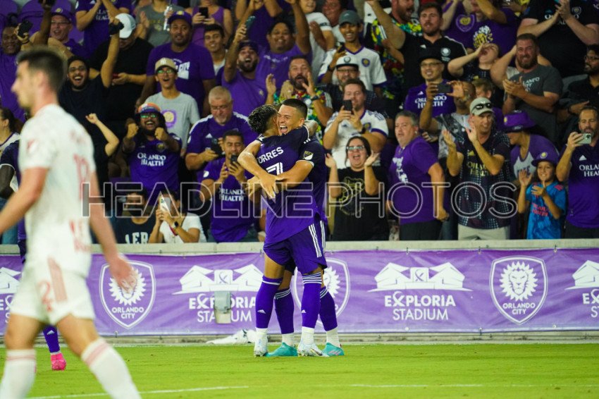 Orlando, Florida, USA, July 27, 2022, Orlando City SC Midfielder Cesar Araujo #5 hugs Facundo Torres #17 after scoring during the US Open Cup Semi Finals at Exploria Stadium. (Photo Credit: Marty Jean-Louis)