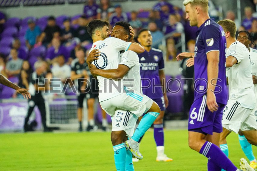 Orlando, Florida, USA, August 6, 2021, New England Revolution Midfielder Wilfrid Kaptoum #5 and Carles Gil #10 celebrate after scoring against Orlando City SC at Exploria Stadium. (Photo Credit: Marty Jean-Louis)