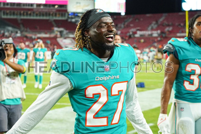 Tampa Bay, Florida, USA, August 13, 2022, Miami Dolphins player Keion Crossen #27 smiles after defeating the Tampa Bay Buccaneers at Raymond James Stadium. (Photo Credit: Marty Jean-Louis)