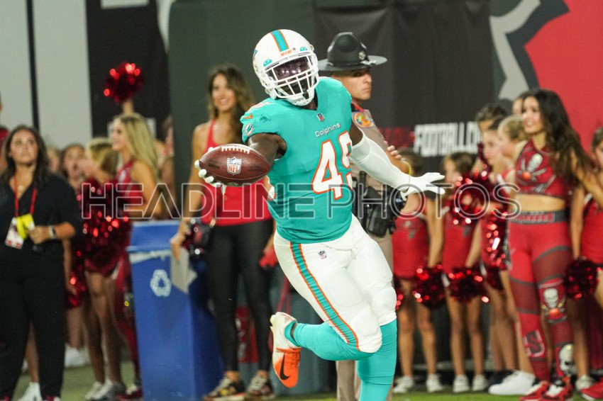 Tampa Bay, Florida, USA, August 13, 2022, Miami Dolphins Linebacker Sam Eguavoen #49 makes a touchdown in the second quarter at Raymond James Stadium. (Photo Credit: Marty Jean-Louis)