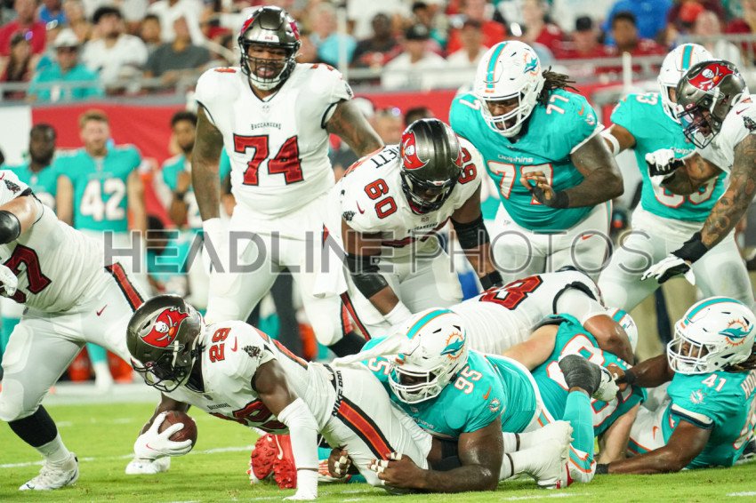 Tampa Bay, Florida, USA, August 13, 2022, Tampa Bay Buccaneers running back Rachaad White #29 gets sacked at Raymond James Stadium. (Photo Credit: Marty Jean-Louis)