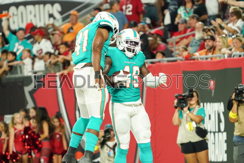 Tampa Bay, Florida, USA, August 13, 2022, Miami Dolphins Linebackers Sam Eguavoen #49 and Darius Hodge #41 celebrate after touchdown in the second quarter at Raymond James Stadium. (Photo Credit: Marty Jean-Louis)